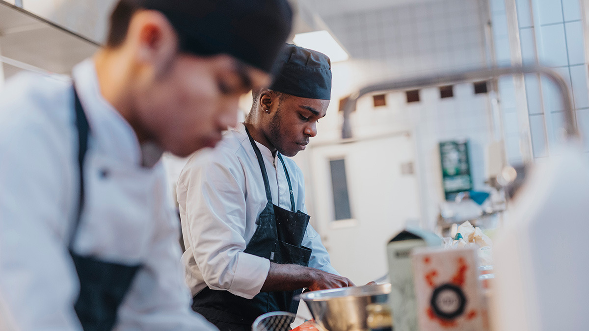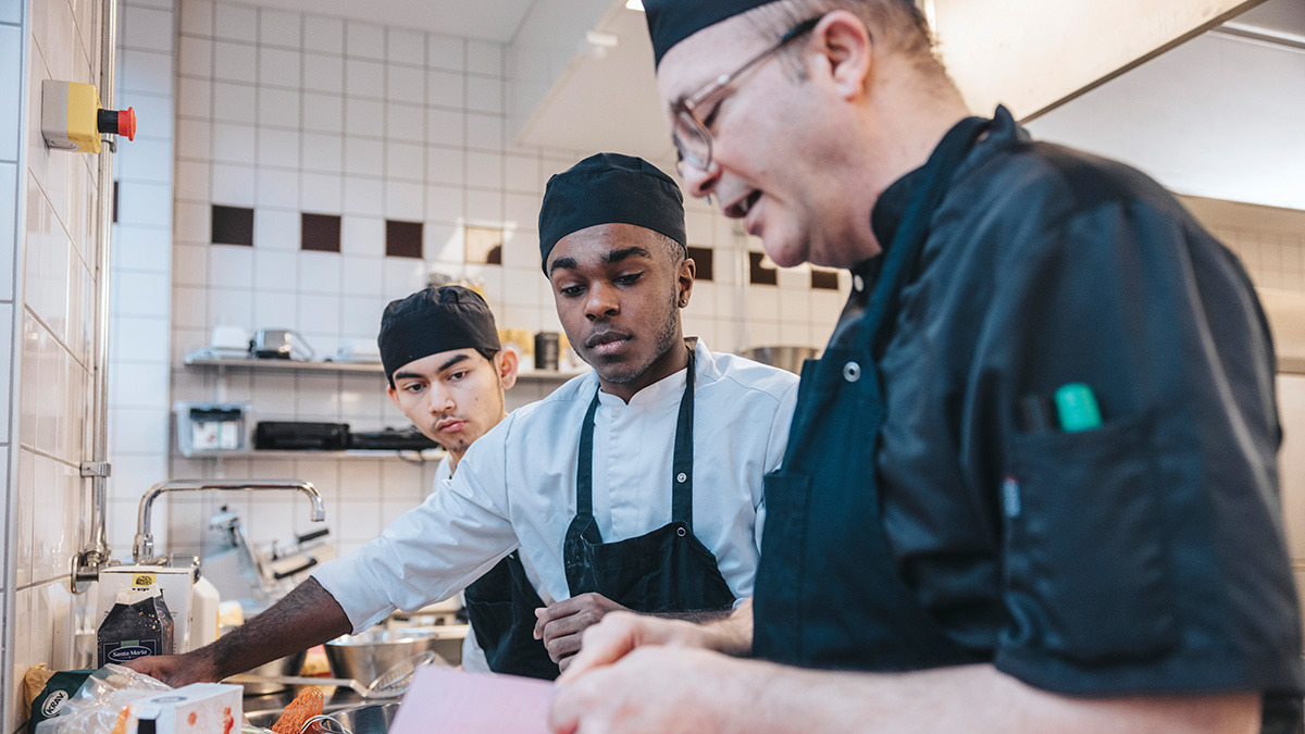 Det hackas och rivs för fullt vid köksbänkarna på Malmö Restaurangskola. Eleverna Kevin Nilsson och Marley Karlsson Touray tränar inför en kommande tävling.