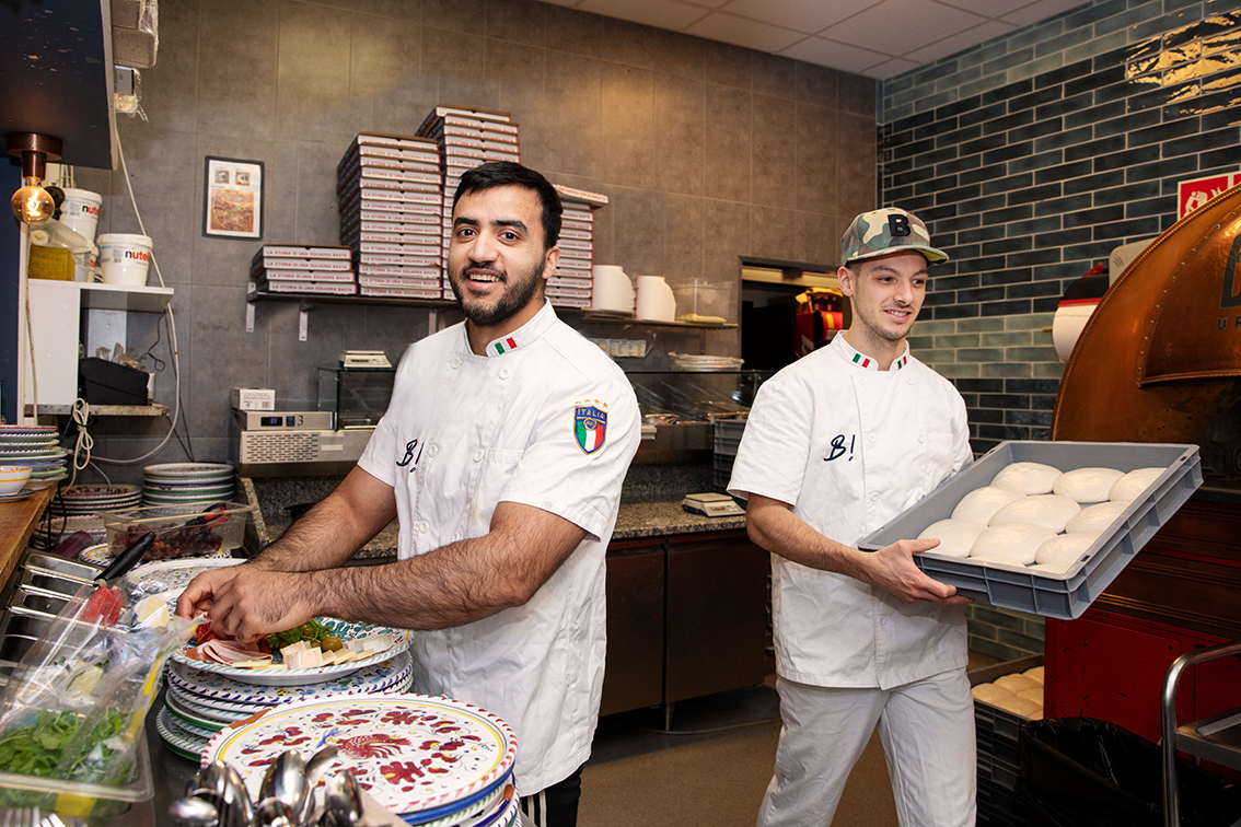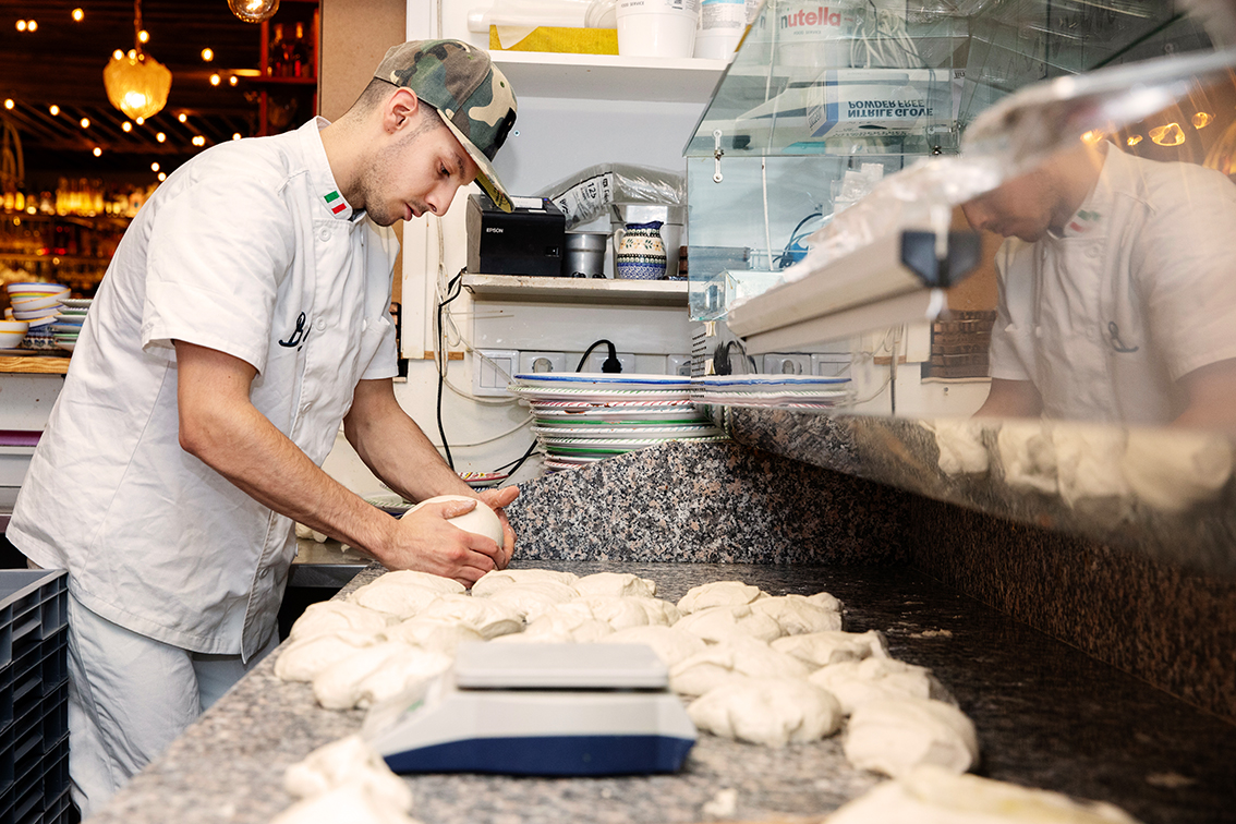 Klockan 15, en timme före öppning, kommer kökspersonalen. De slår på den stora pizzaugnen, gör pizzadeg, för­bereder pastamaskinen och preppar topping som salami, ostar och grönsaker.