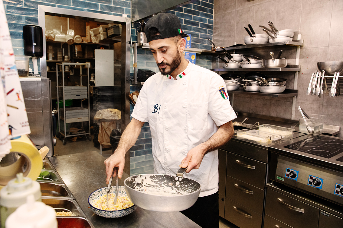 – Jag lärde mig att baka pizza av pizzakocken, sedan fick jag börja med prepp och när jag kunde det frågade jag vår CEO, Brazer Bozlak, om jag fick prova något mer. Han svarade att det alltid finns möjlighet att göra nya saker, så jag fick hoppa över till andra sidan köket och lära mig pastastationen. När jag såg hur kocken blandade pasta kände jag att nej, det här kommer inte funka för mig, det går för snabbt! Men det var faktiskt lättare än jag trodde.
