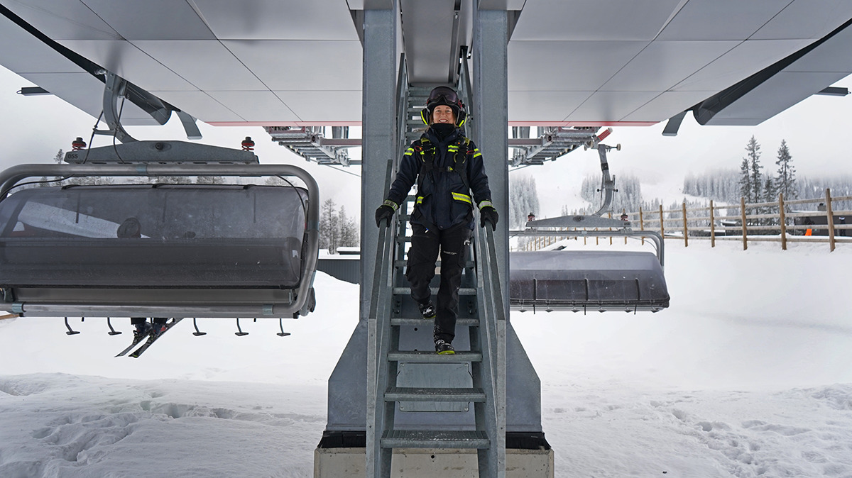 På morgnarna testar Mika nödstopp och kollar så att allt rullar och inget har fryst fast. Under dagen åker hon runt mellan backarna och löser problem. Medan snöteknikernas mest intensiva period är före högsäsong, har Mika mest att göra när åkarna är som flest.