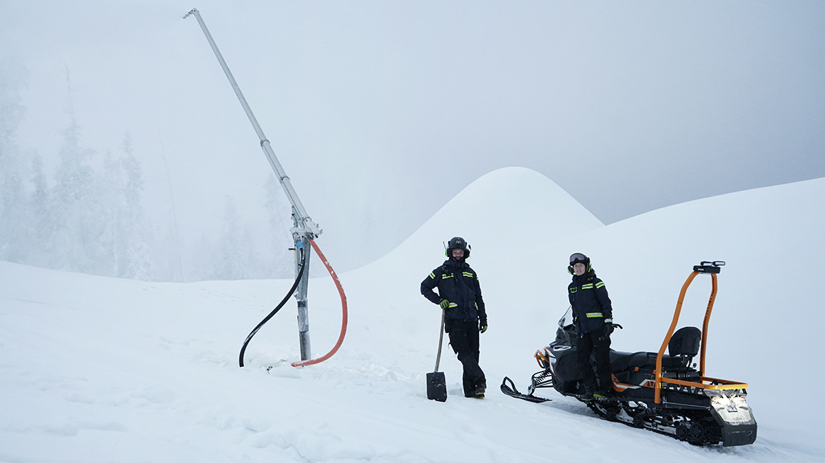 Olof Ehn och Mathias ”Malte” Sjögren, snötekniker på Skistar Sälenfjällen, parkerar skotrarna vid en av de höga snökanonerna. De duschar ut moln av nytillverkad snö över Väggen, en av Sveriges brantaste och snabbaste backar. Fartrekordet här är 198 kilometer i timmen.