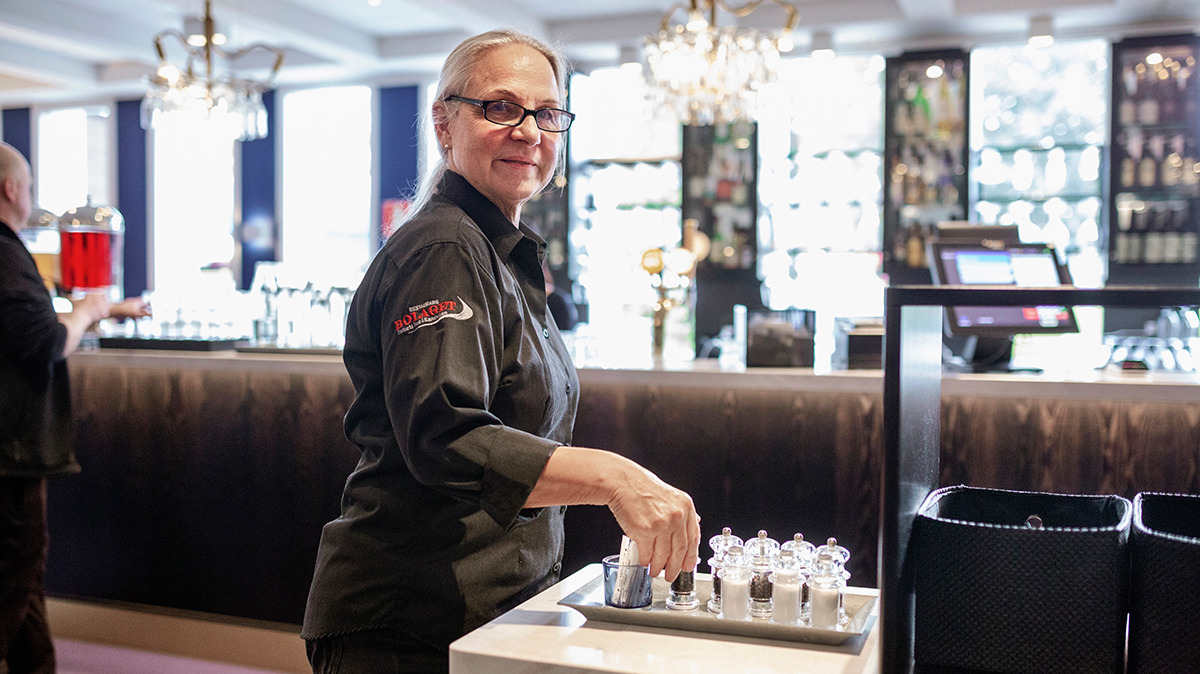 Linda är både bartender och servitris. Under lunchen hjälps hon och Lena Åman åt att plocka undan och hålla snyggt efter lunchgästerna.