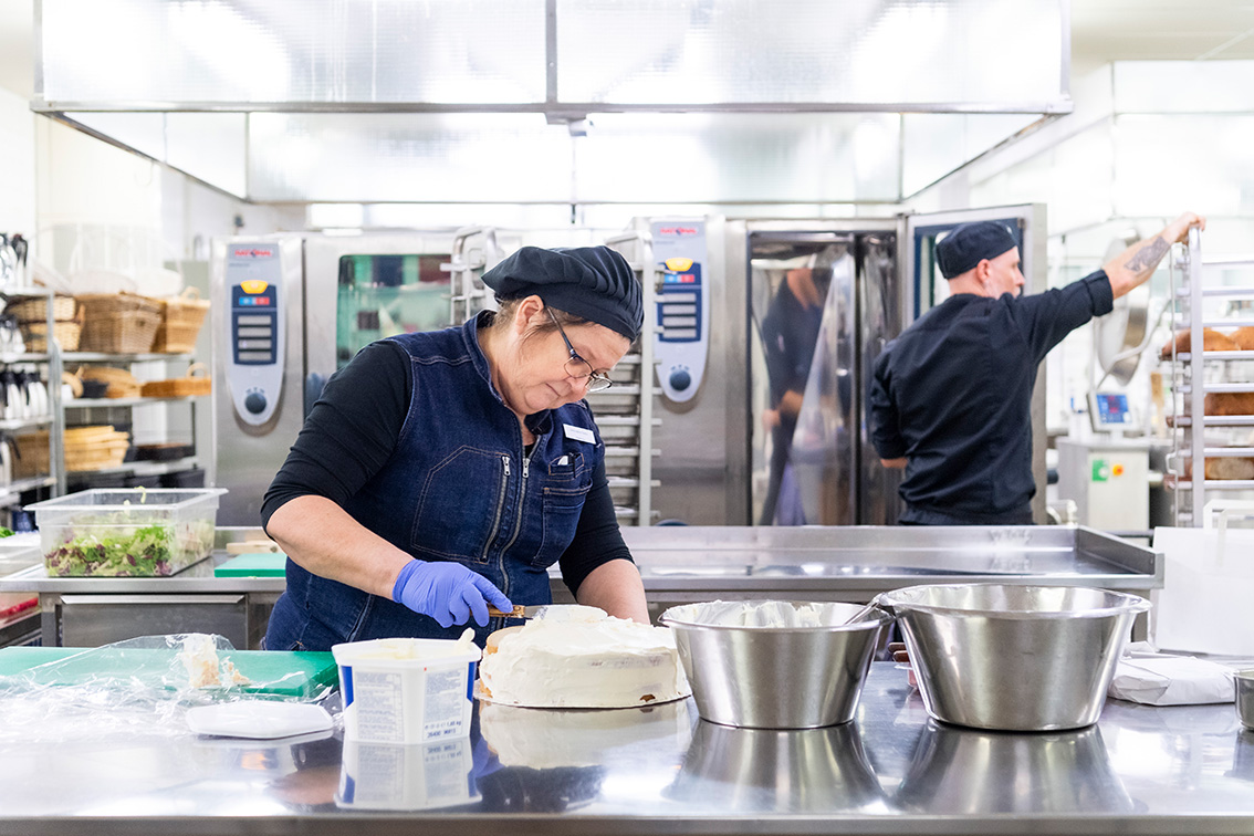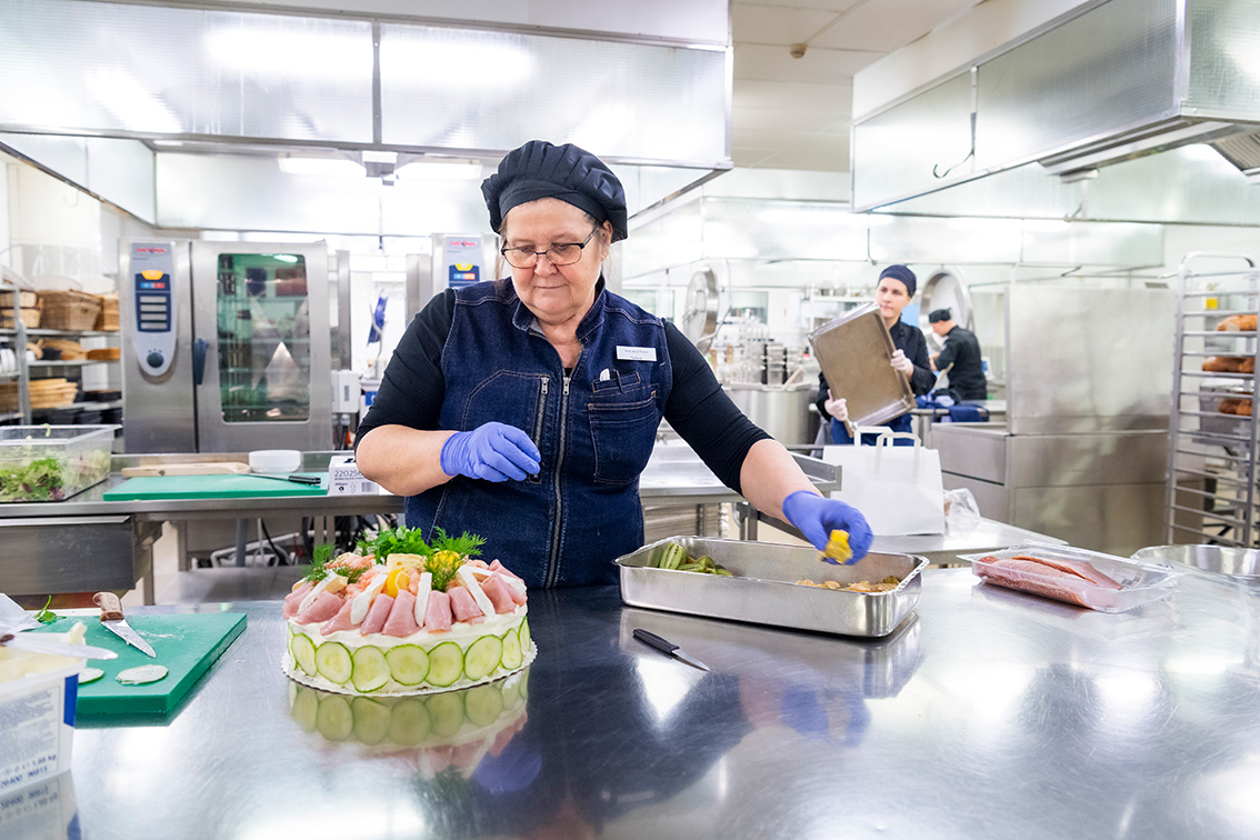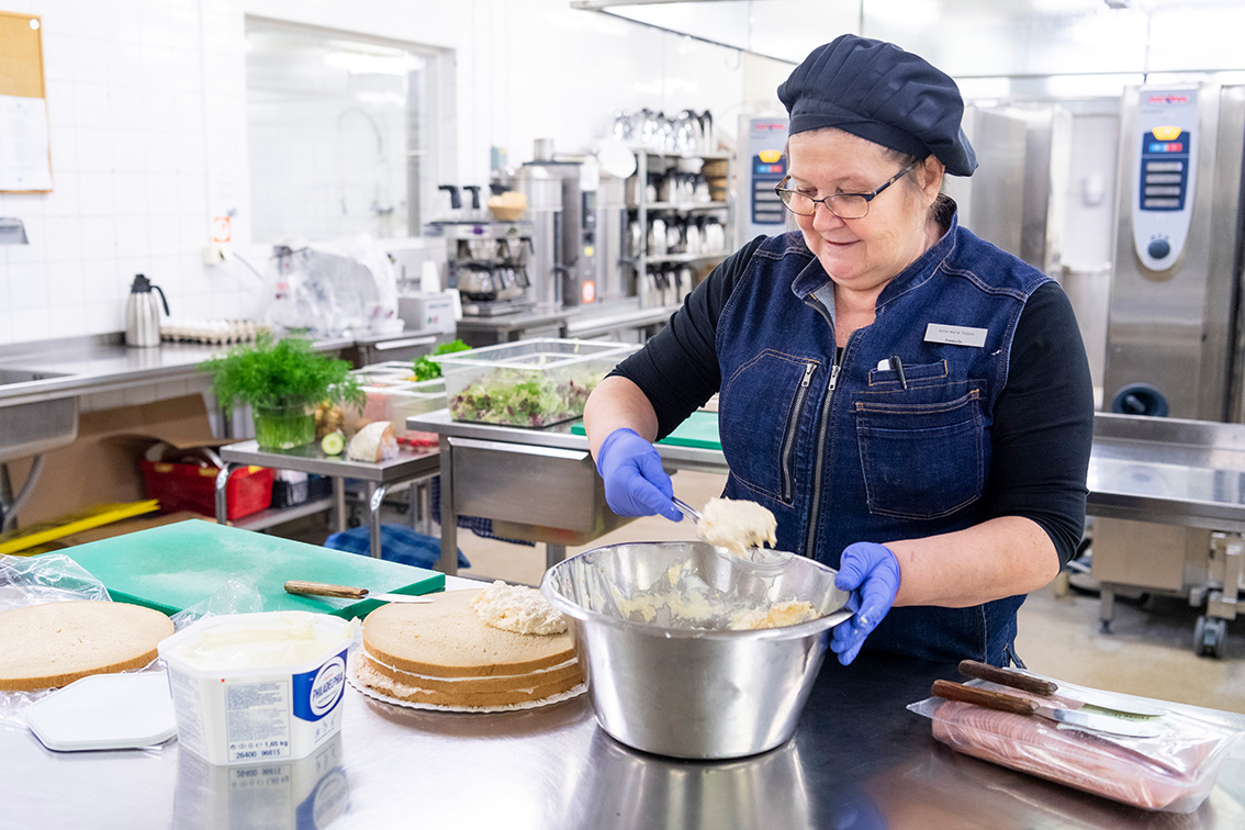 Vi har gått från 900 till 100 gäster, eftersom gymnasieeleverna också är hemma just nu. Det är ingen catering till fester. Men det kommer in beställningar på smörgåstårta till arbetsplatserna i alla fall. Då gör vi den i portionsbitar, så att folk inte ska behöva ta från samma.