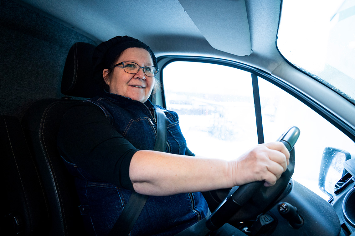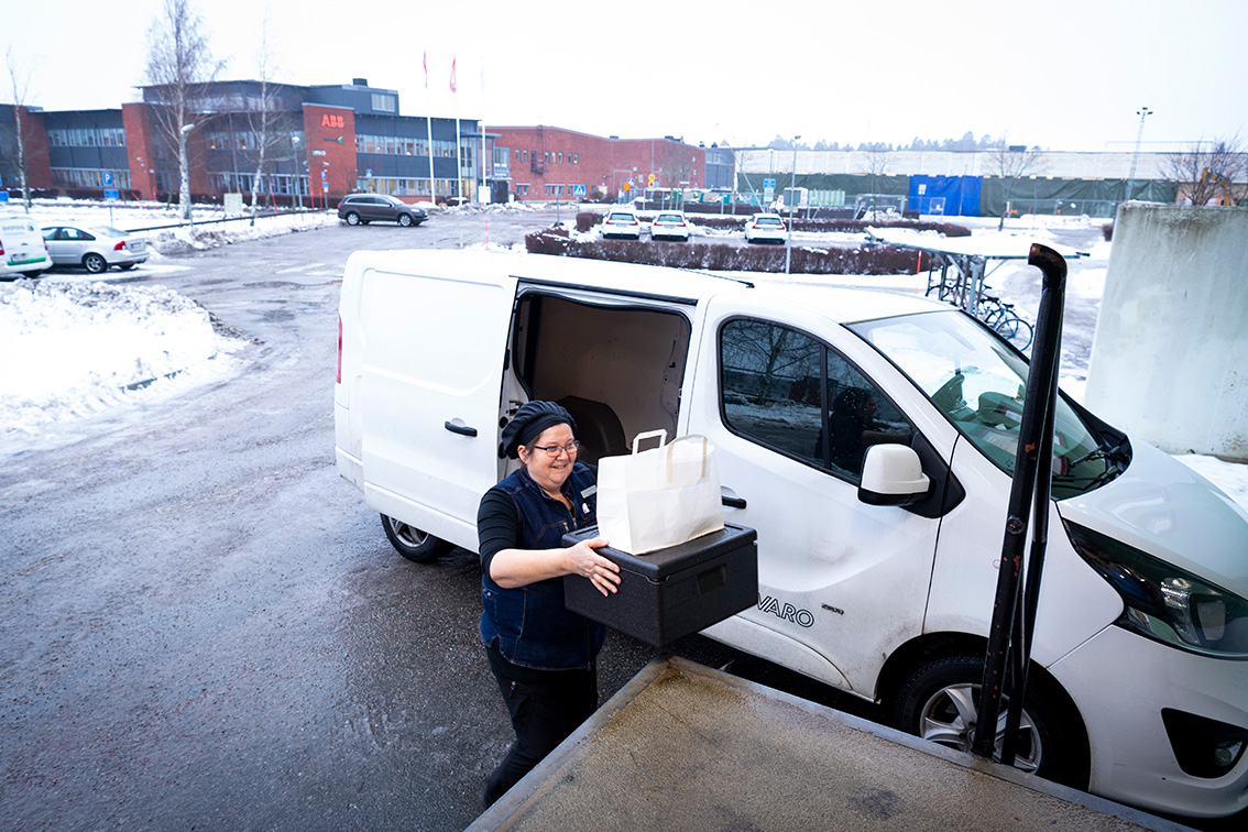 Jag åker mest runt till företagen i området, ibland ner på stan. Folk vill ha matlådor med dagens eller kaffe och smörgås.