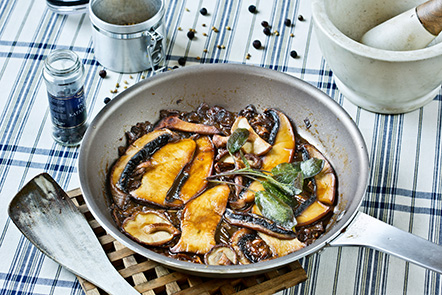 –Stek sakta svamphack och kryddor i 2 msk smör, cirka 5 minuter. Vänd ner ½ tsk finstrimlat apelsinzest och salvia, fräs 1 minut.