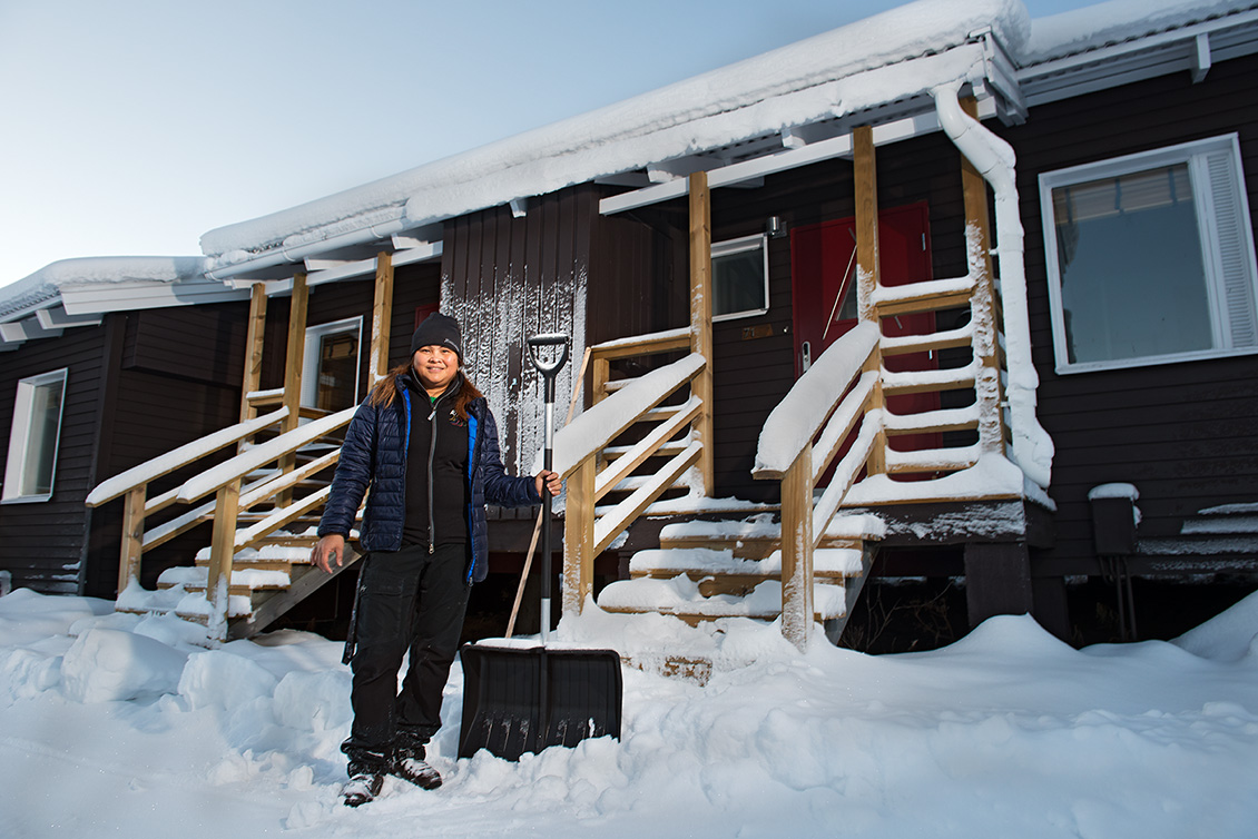 Utanför en av stugorna skottar Na Korn-Ngam snö. Hon har bott i Kiruna sedan 2003.